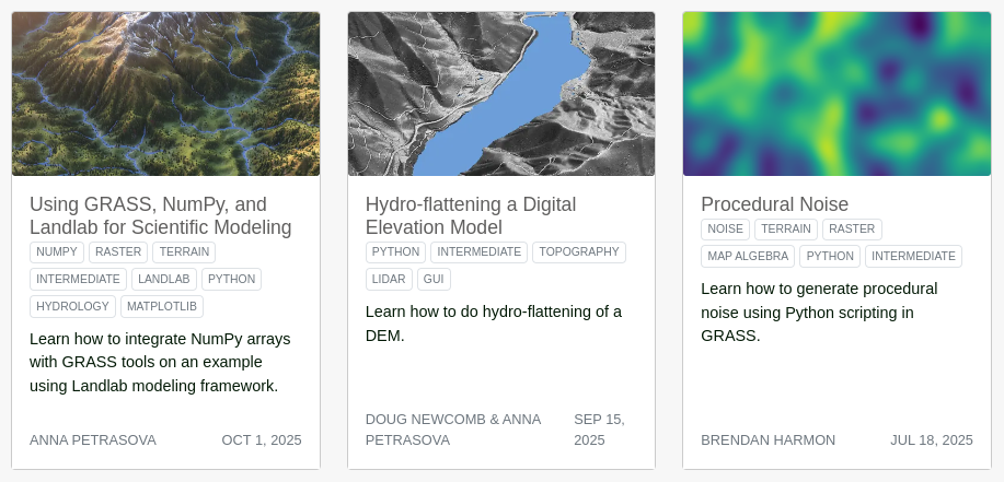 Our tutorial platform grew significantly this year, with 20 new tutorials bringing the total to over 50. The new additions include 2 tutorial collections, 2 translations into Portuguese, and several externally linked tutorials from community blogs. Highlights include tutorials on NumPy integration with Landlab by Anna Petrasova, series of tutorials on spatio-temporal data handling by Veronica Andreo, hydro-flattening DEMs by Doug Newcomb, generating and modeling terrain by Brendan Harmon, introductory geospatial tutorials by Michael Barton, and species distribution modeling by Paulo van Breugel.